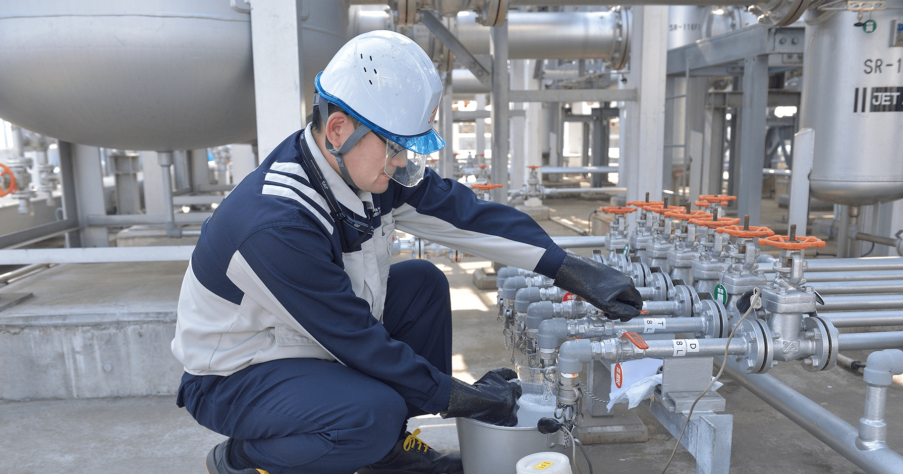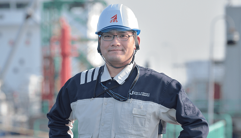 千葉事業所で、航空燃料の品質管理・荷受代行を担当しています。燃料は航空機の運航に欠かせないもので、それだけに迅速かつ安全に荷揚げを行うことはもちろん、品質管理も徹底して行います。燃料を運んできたタンカーやタンクに貯蔵された後など、何度も検査を重ね、航空燃料として適切なものかどうか確認しています。非常に責任の重い仕事ですが、作業責任者として一連の作業を無事に終え、その燃料を搭載した飛行機が大空に飛び立つ姿を想像すると、この仕事をやっててよかったと実感します。航空機の安全運航を担う一員として、これからも燃料に真摯に向き合っていきます。