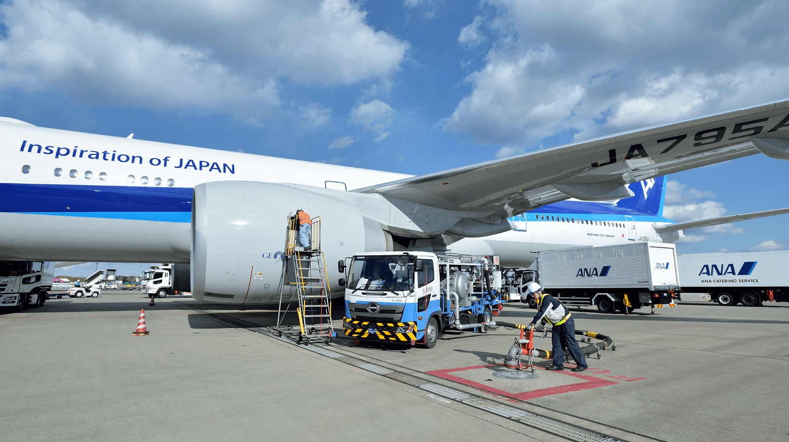 毎日大量に使用される航空燃料。これは、主に、国内の各製油所などからタンカーにより運ばれ千葉港頭石油ターミナルに荷揚げされたあと、パイプラインによって成田国際空港まで輸送されます。そして、エプロン地下に埋設されたパイプを通じ、当社のサービサー(給油車両)を介して、航空機へと供給します。